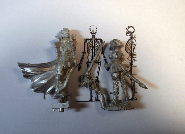 The image above shows the skeleton diagram I’ve been using for years, courtesy of Patrick Keith, which I blew up in Photoshop, modified for female skeletal proportions (smaller ribcage, larger pelvis, same size limbs), and then printed out to let me begin creating the skeletal armature. I’ve placed two models beside it to give you an idea of the size– on the right is a fairly average Reaper mini, while the left is the tallest Infinity model I could find in my collection. Ram Lady will tower over both. 🙂