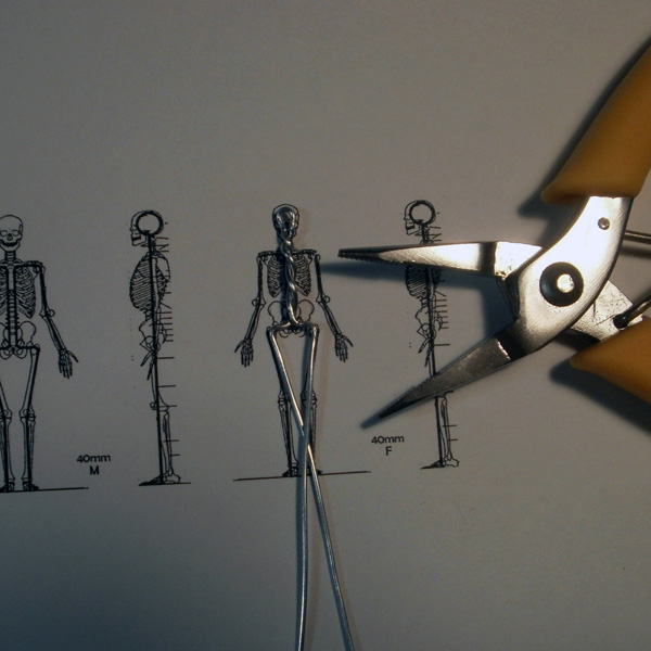 As usual, the armature is twisted from 20ga aluminum picture wire. A loop is created for the head, then the two sides of the wire are twisted down the spine before being split apart to form the legs. I make sure not to let the wire go out too far on the hips, as this will generally poke out of the final model.