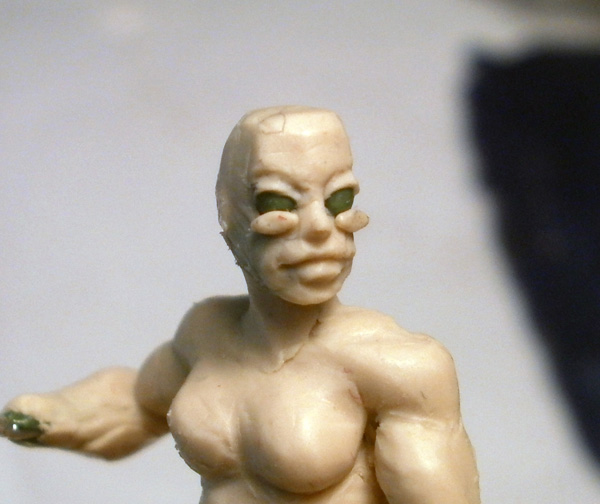 This left the eyes well-framed in the center of the face, but they were far too wide, ending all the way on the side of her head. I applied some clay around the outside to begin closing them off.