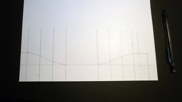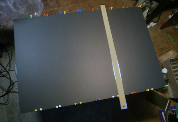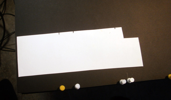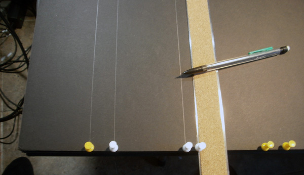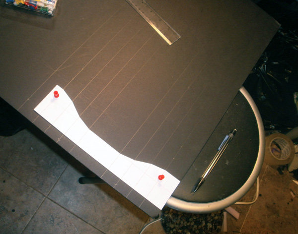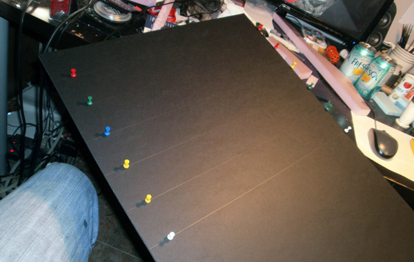 To get clean lines all the way across the 20″ foamcore sheet, I placed pushpins on the cutting points, which then held the ruler still while I drew my pencil lines.
