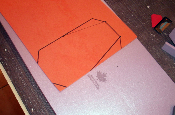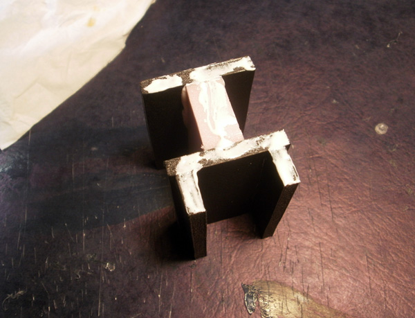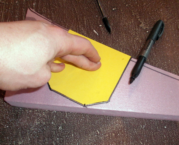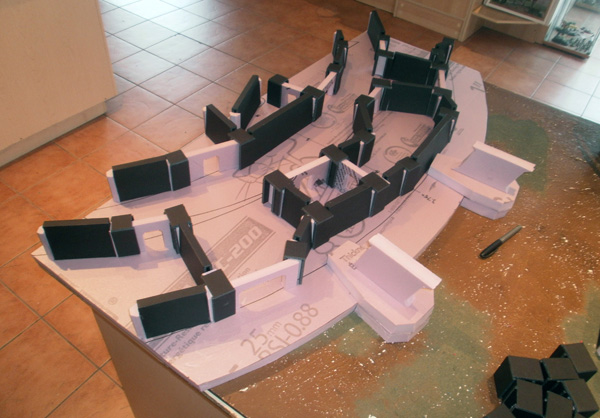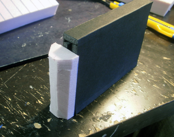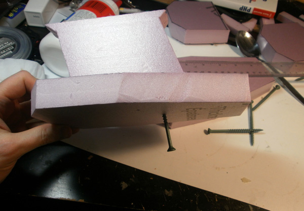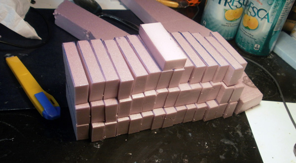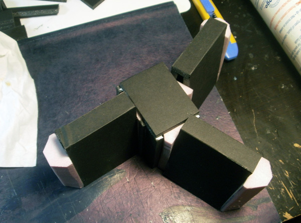 Once all of the walls were cut, cored, folded in, and glued into their trapezoidal shapes, I dig out some pink styrofoam to create the linkages that would connect multiple wall segments together.