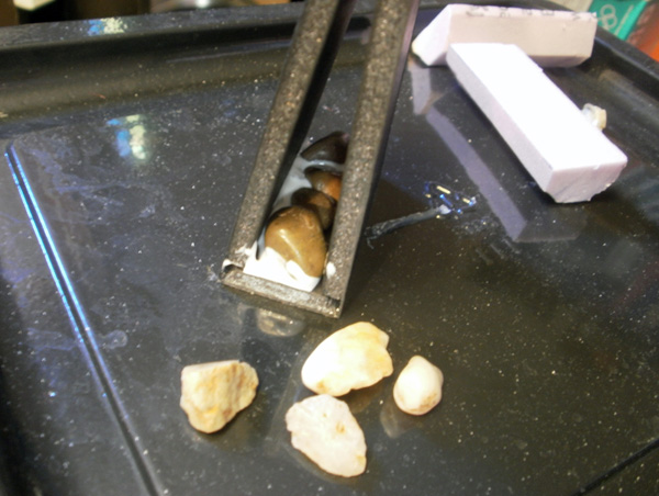I squeezed some white glue into the bottom of each wall segment and filled it with small rocks, which would keep it upright as previously discussed.