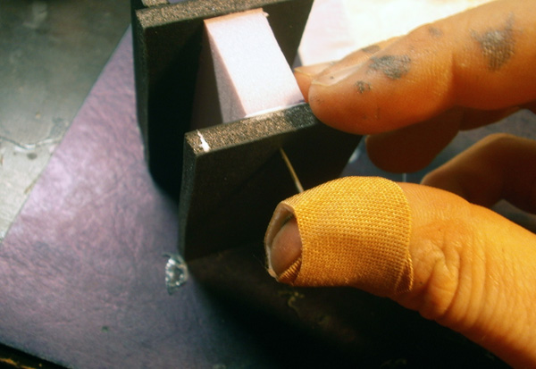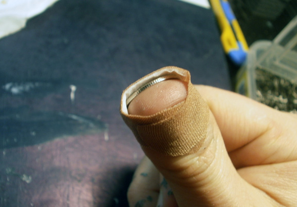I don’t trust glue for permanent attachments, so I like to reinforce my foamcore construction with screws and nails wherever possible. I bought some 3/4″ finishing nails, and cobbled together a “nail pusher” by attaching a dime to my thumb with a band-aid.
