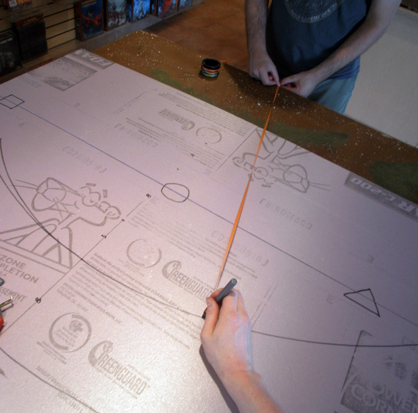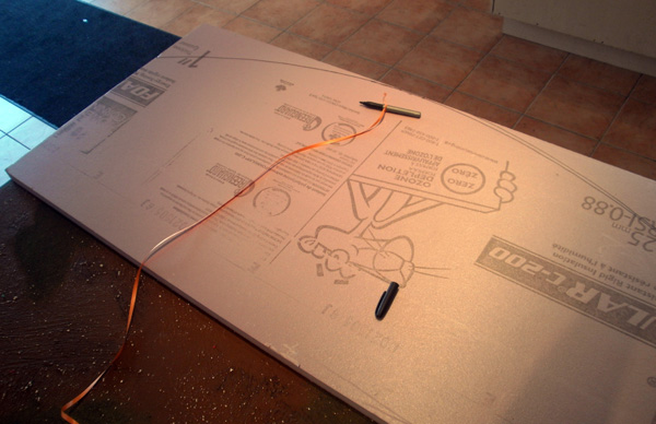 To create the shape, the ever-present Tom held down the end of a ribbon tied to a marker, and I drew concentric arcs onto the styrofoam sheets. The platform was broken into two pieces so that we could choose to have a “mostly station” board or a “mostly space” board, with a 1-foot extension piece being added or removed to accommodate.
