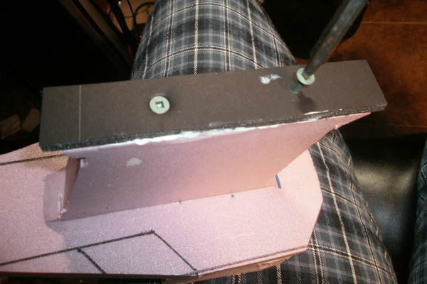 This bottom strip would be glued to the styrofoam risers you saw about ten pictures back, but I don’t trust a glue-to-styrofoam bond, so I glued and screwed a second thin strip down into the top of the riser to give a better contact point.