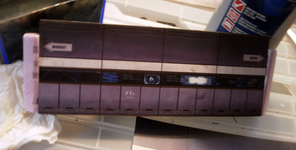 Next, I moved on to gluing the white panels onto the couplings. However, I immediately ran into a problem: they were too tall. While the wall segments were 3″ tall, the foam end pieces were a half inch shorter. Even with an extra foamcore sheet’s width added on top, the couplings were still only about 2.75″ tall, leaving the white strips improperly sized to fit them.