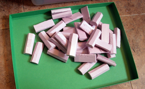 Out of all of the regrettable improvised design mismatches in this terrain set, this wall pattern is probably the second most successful (after the incredible fluke of brilliance that was the Spud Curve, of course). My terrain set had four different lengths of walls– 2″, 4″, 6″, and 8″– and would eventually have variations of those with walls cut into them. I needed the wall texture to work in any of those wall lengths, and still look good when repeated over twenty-plus total feet of wall space.