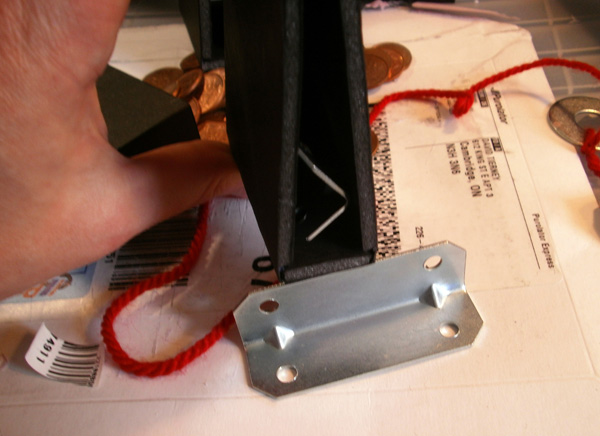 I couldn’t find the bag of rocks I had originally used for weights, so I scrounged around my apartment for other things I could use as weights. These L-brackets turned out to be perfect for the very large 8″ walls with 4″ doors, sliding in snugly in the space on either side of the gate.