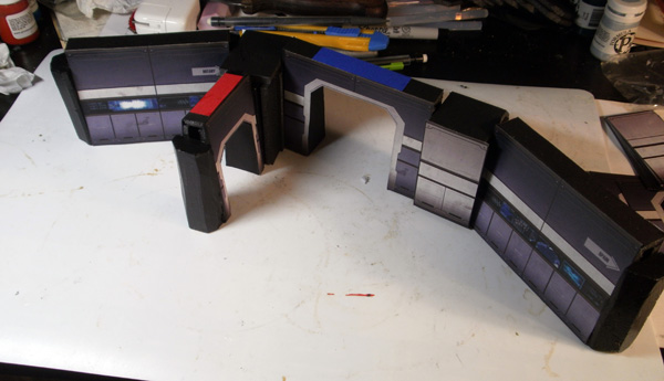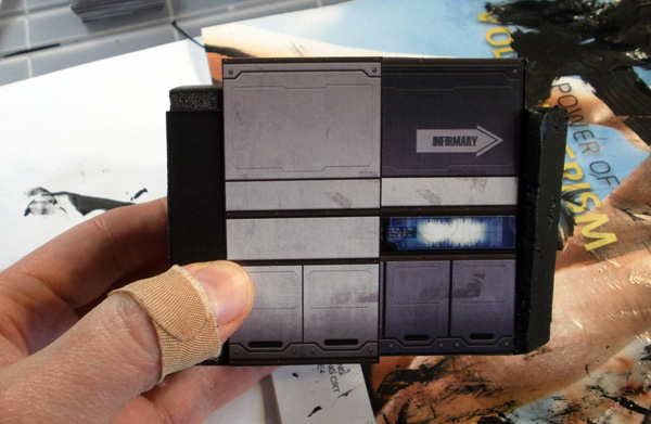As an added touch to help board legibility, I glued a paper strip to the top of each doorway to indicate its location and width. Narrow red strips for narrow doors, and wide blue strips for wide doors. Once the board is assembled, these strips let you plan paths through the station from overhead, knowing at a glance which doors your larger models will fit through and which they won’t.