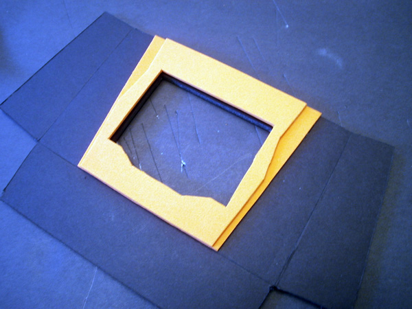 I glued these two pieces to each other, attaching them for now only from the top. After I painted everything, I could lift the frame, place the reflective paper inside it, and then glue the remaining edges down.