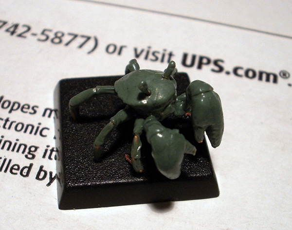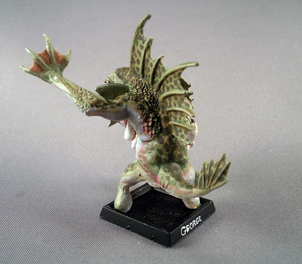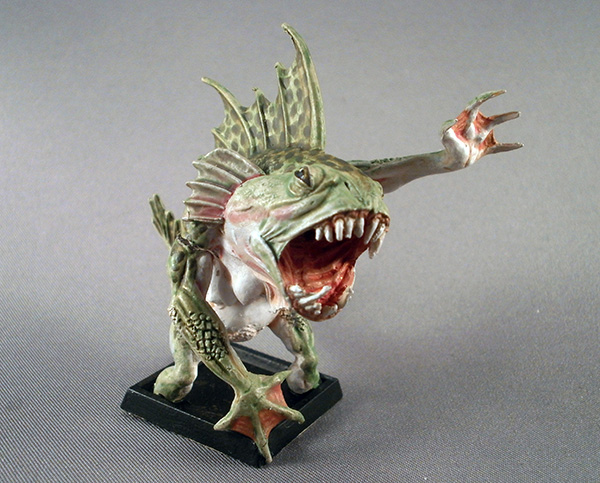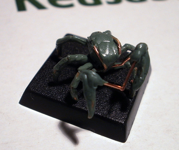 Cruelty is added through two washes– one of 50% GW Catachan Green/50% Wurm Green, and then a second of 50% Catachan Green/25% Regal Blue/25% GW Dryad Bark.