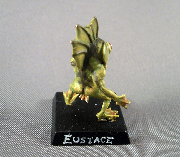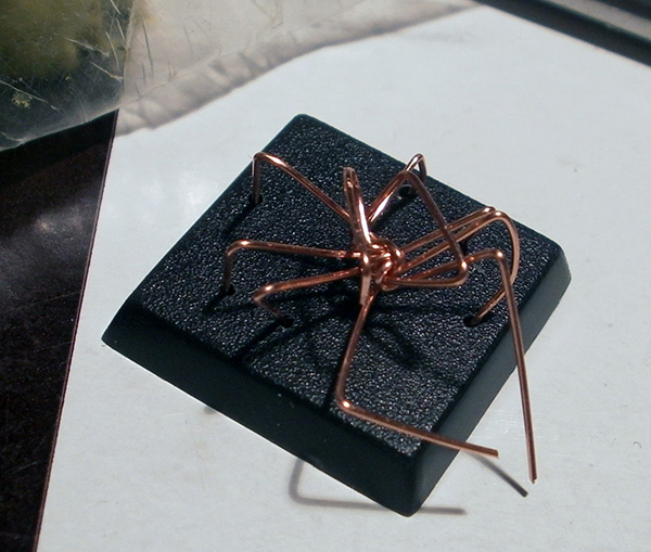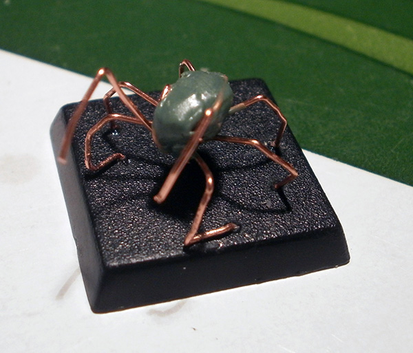 I drilled lots and lots of holes into a small square GW base and planted Manny’s legs underneath, bending each flat so it wouldn’t slide back out the top.