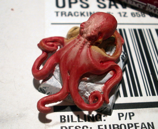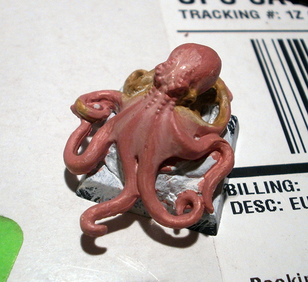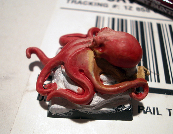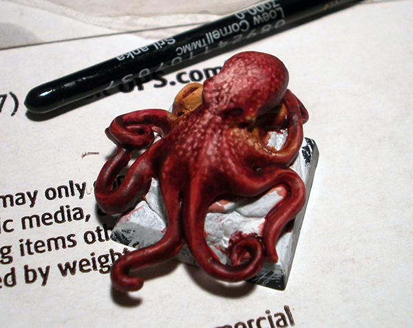 I then applied a thin wash of 50% Red Gore/50% GW Tausept Ochre to the lower areas of the yellow blend, followed by a pure Red Gore blend toward the tips of the 3rd tentacle from the front (on both sides).