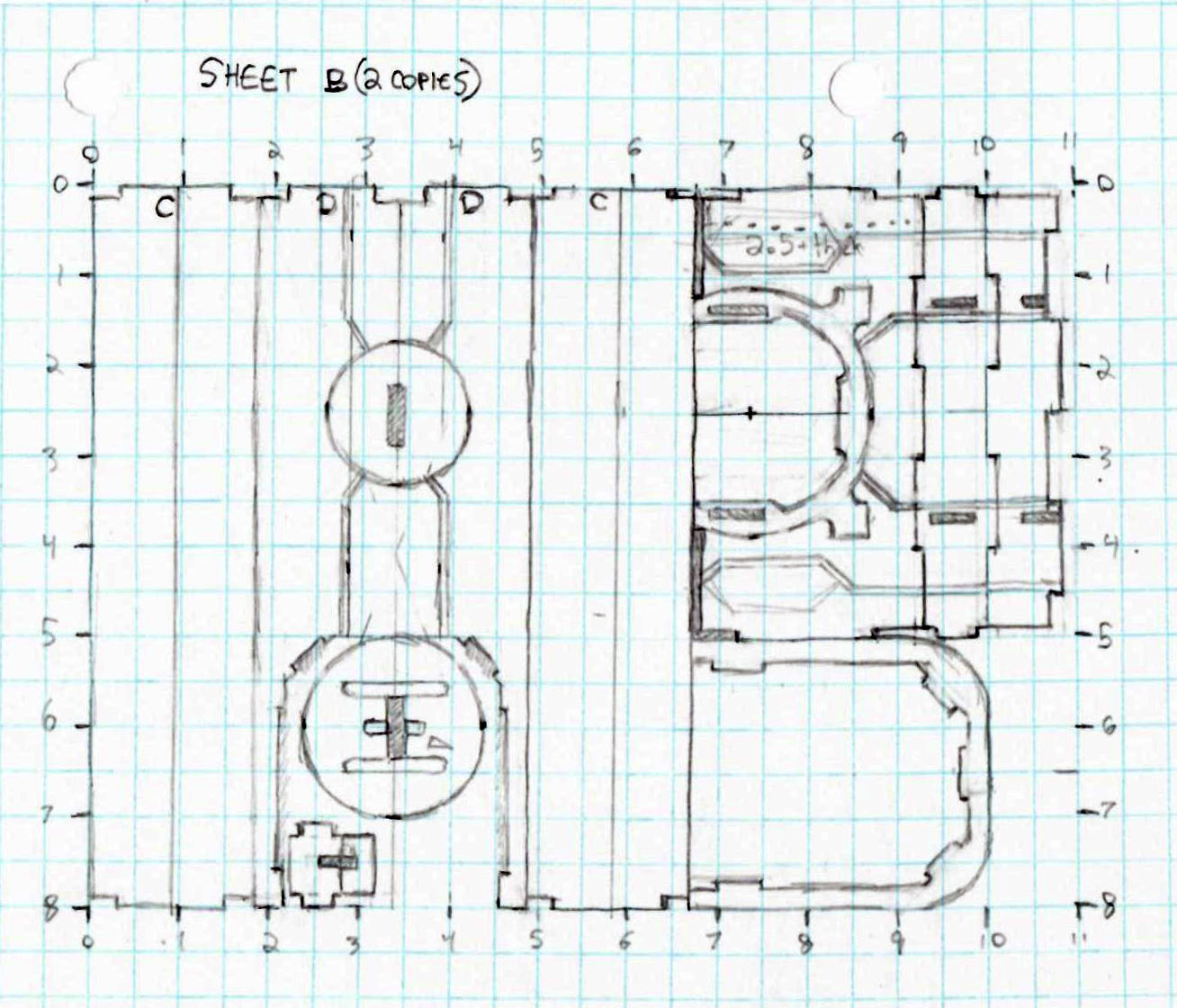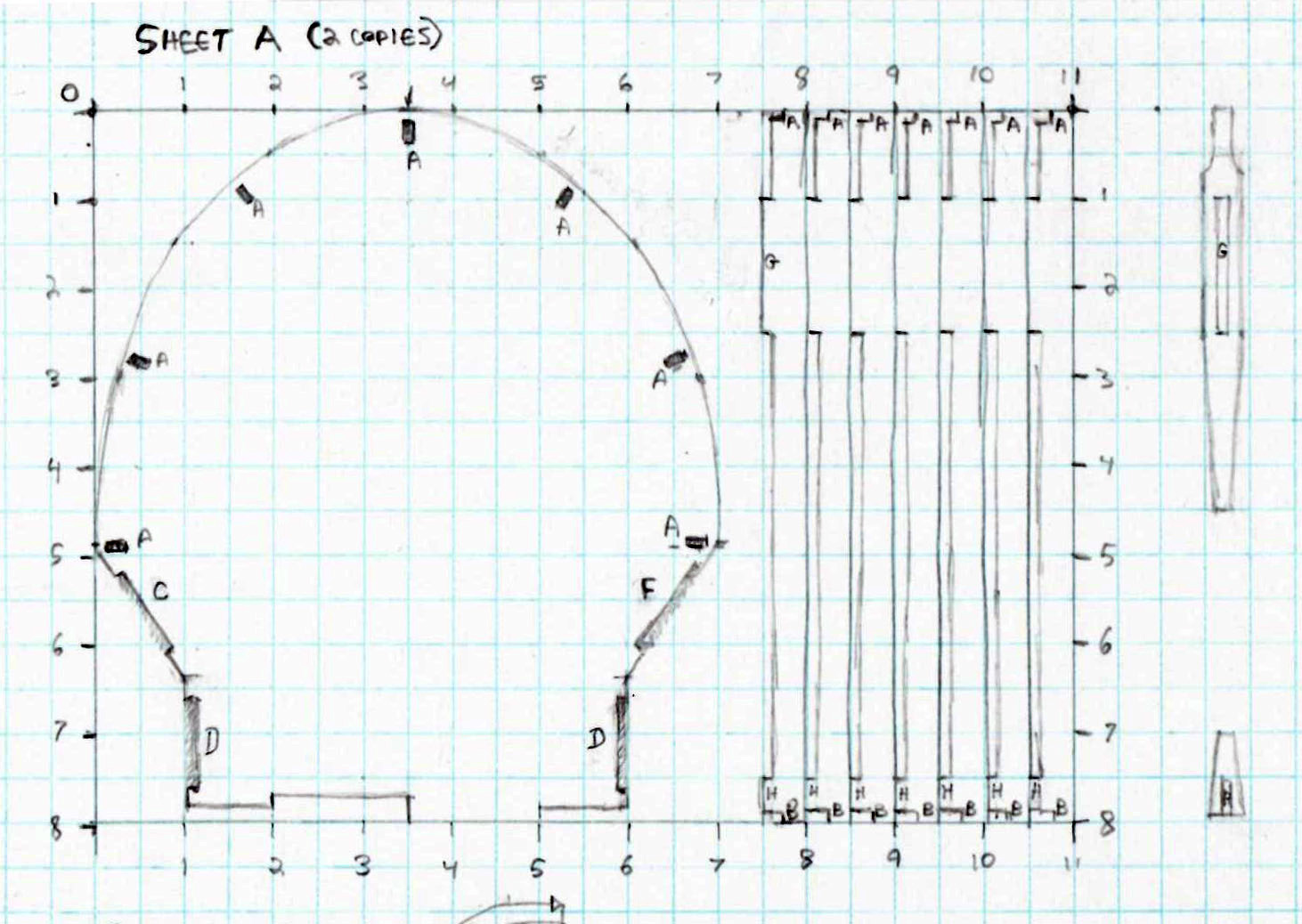 The first sheet is the top of the tower and the seven uprights that hold it up. The “skin” of the tower would be build from soft cardboard (shown on a later sheet), with the clips on the right side used to hold the cardboard down to the uprights. Note that I actually ended up forgetting about the clips after I drew them, never actually allocating them space on any sheet to actually produce. Oops. ~_~