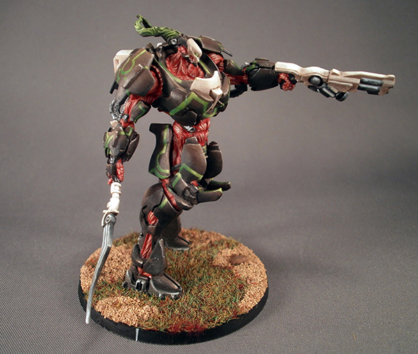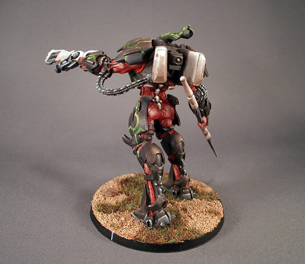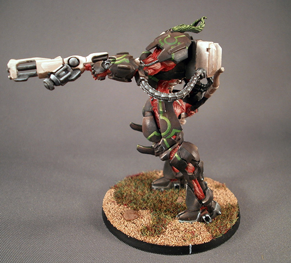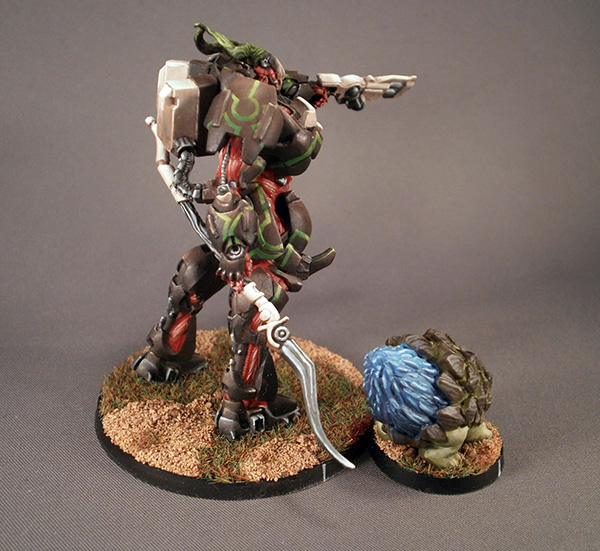 Speaking of rushed models, let’s jump over now to the Gorgos’s slightly more vulnerable living core. Unlike a normal TAG, whose pilot only sees the table when it voluntarily dismounts to push buttons, or is forcibly ejected by hackers, the Gorgos’ pilot is a pretty regular fixture in my games since it’s actually just the Gorgos’ extra “naked wound” once it’s taken three damage in TAG form. When that occurs, you pull the gigantic TAG model off the board and replace it with a standard Light Infantry model, which can either run to safety or try to keep mowing models down with its Spitfire.