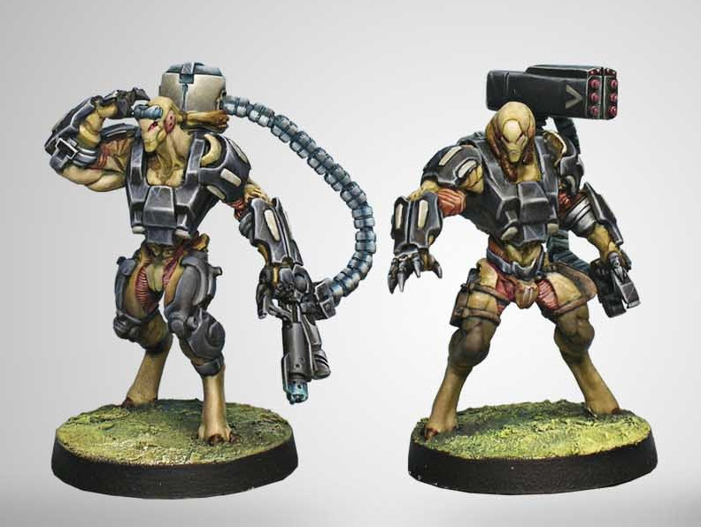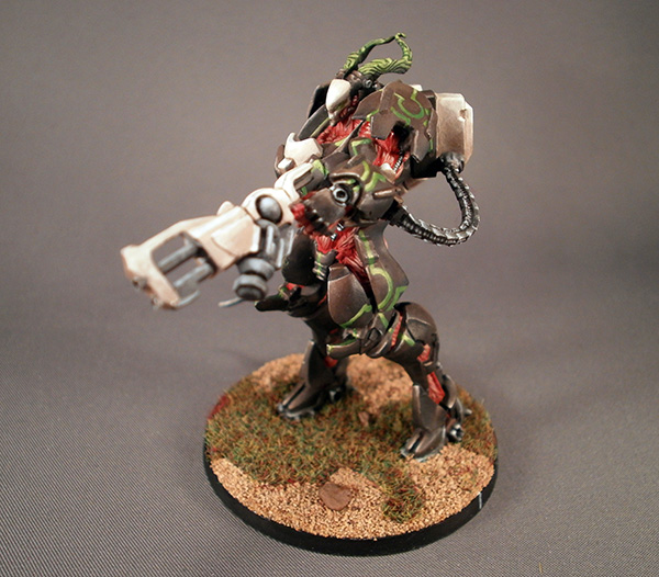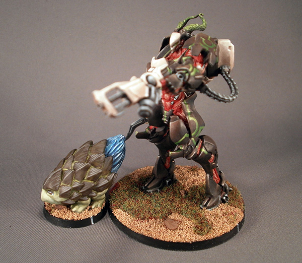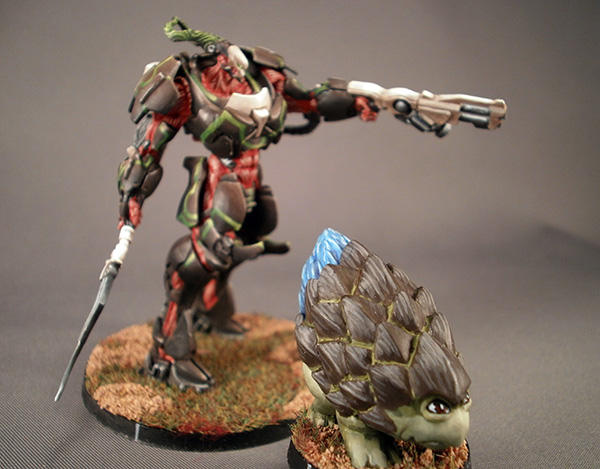 And somewhere in between those two, right after CB previewed the hoodie-wearing badassness of the Kotail, I picked up my first Tohaa models. I built this army much more slowly than I had my others– starting with max AVA of Kotails and basically no concrete plans for where I wanted to go from there– so it was quite a large jump in my stock when another local (and amazing painter) named Kyle passed me the remnants of his own brief dalliance with the Space Asparagus. Kyle is much more drawn to the painting aspects of the hobby than the gaming part, so he tends to collect odd bits and bobs from multiple games and paint whatever suits his fancy at a leisurely pace. A… very leisurely pace, at times. π As a result, he often ends up with a very large backlog of models that he thought he might want to paint someday that subsequently faded from his favour, which he’ll generally sell off cheap or just give away to the noblest and most deserving people he knows (*cough*). This is how I came to own a Tohaa starter box and a Gorgos TAG, which literally formed the playable core of my army when I was still waffling over which space vegetables I wanted to play, and the latter of which is the focus of today’s article further down the page.
