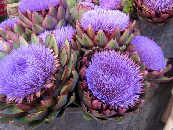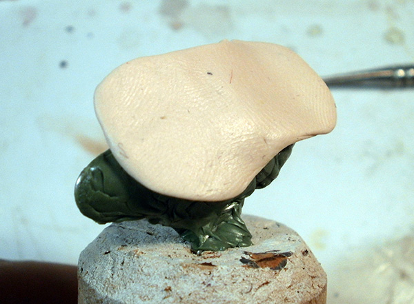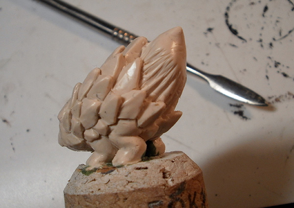 To mimic the artichoke flower’s multitude of round spiky bits, I went around with a knife and pressed long triangles all around the exposed butt cone.