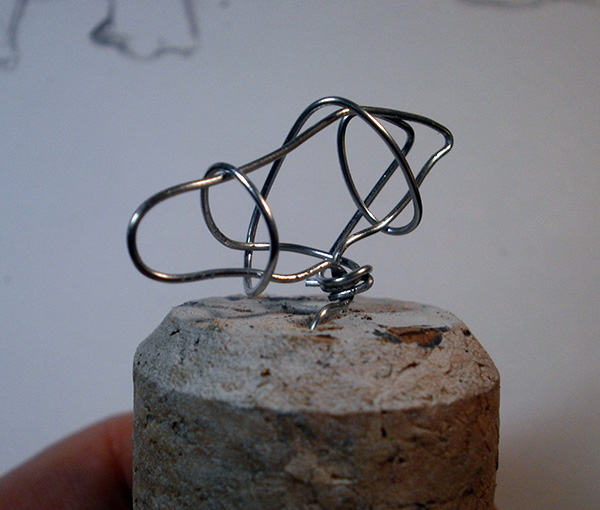 The entire process of sculpting Mama Hedgehog took about three hours on the night before I drove down to Chicago. I started by sinking a wire into a champagne cork, and then twisting it vaguely into the bean-like shape of Mama’s body.