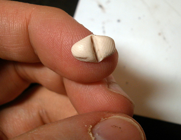 The sculpting process for leaves was very quick– apply a triangle of clay, squish it flat in front, and then give it an angular ridge down the center.