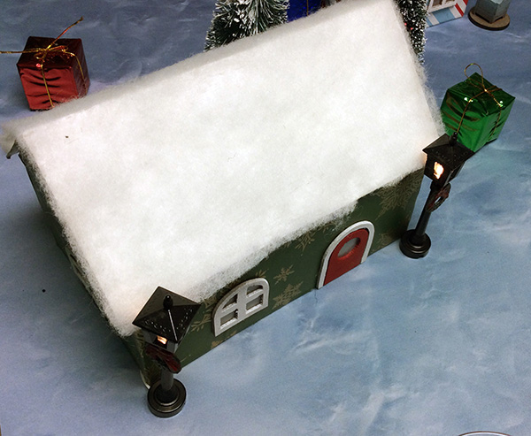Instead of leaving tea lights on all week, I ran a string of older incandescent Christmas lights under the fuzzy white snow sheets, cutting small holes under each building for a few bulbs to poke through.