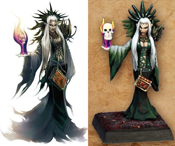 To be honest, the original art for the diabolist is a bit awkward, and the miniature is comically bad in some areas (the goofy skull, the mediocre hair, the way-too-thick crown, etc…), but the underlying costume design is solid enough to work with. I only needed to goth her up another 20% or so and give her a suitably disdainful expression to complete the look.