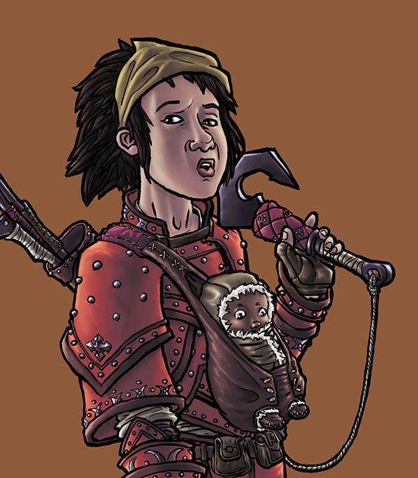 The mini’s armour is extremely simple, so I had to invent some details on the illustration (e.g., chainmail, straps, rivets, and so on) to make it look right alongside the other characters.