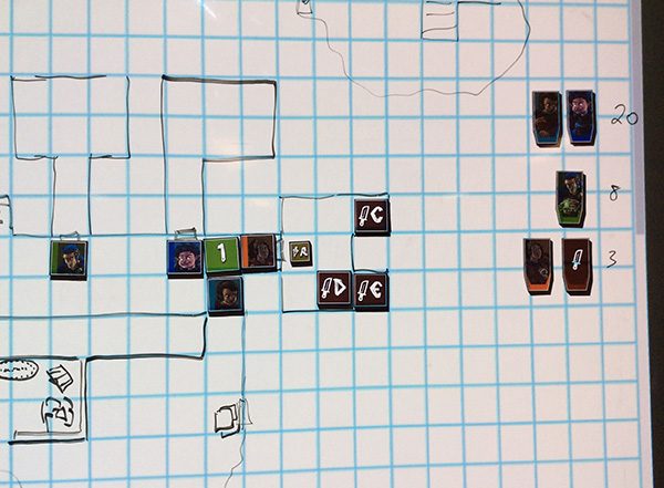 Once the first combat started and the map was up on the board, we needed a way to mark where everyone was. First we tried drawing everyone’s position with a dry-erase marker, but this got a bit annoying once people needed to move. Then, someone mentioned that they had a bunch of magnets on their filing cabinet, and these made things much easier. The magnets were a bit small and it wasn’t always easy to remember which magnet corresponded to which player or monster, but the basic idea of projecting the map and indicating creature positions with magnets ended up being really good, as it let everyone easily see what was going on.
