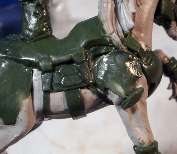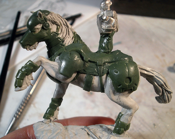 To establish some landmarks to guide the overall construction, I placed putty around the front and back of the seat. I didn’t really smooth this at all; it’s purely under-structure, which would be entirely covered later on in the process. I also put some similarly structural putty down underneath the knight’s chest to keep it stable.