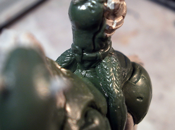 Once the muscle underlay was set, I started applying armour plates over top of it. I had to be pretty careful when applying the putty for these layers; I’m usually pretty sloppy at the edges and just blend any excess into the surrounding areas, but in this case, that would cause the excess to fill in the details on the underlay. To avoid this, I just had to be fairly precise when depositing putty and carefully cut and lift excess material away if I overshot it.